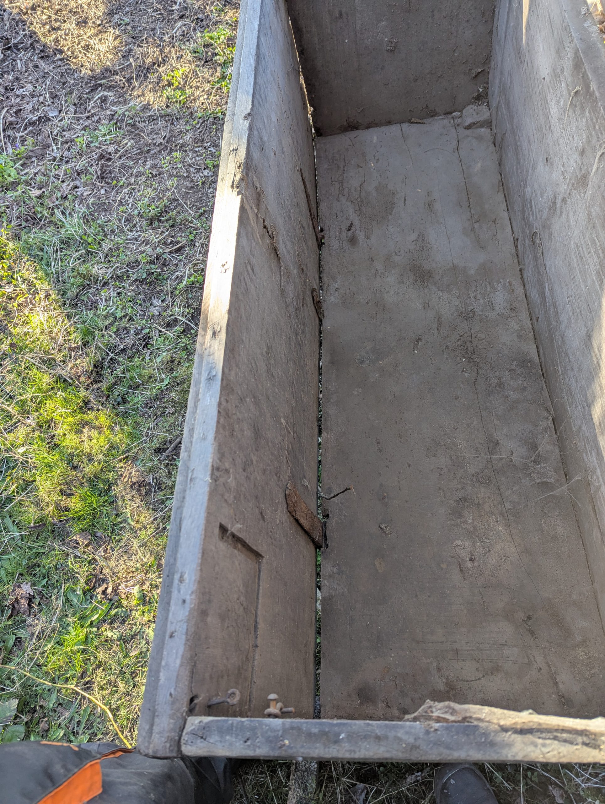 Die Konstruktion weist dübelverleimte Eckverbindungen und eine massive Deckplatte auf. Der Innenraum ist unbehandelt und zeigt eine alterstypische Patina. Die Rückwand ist ebenfalls original erhalten.