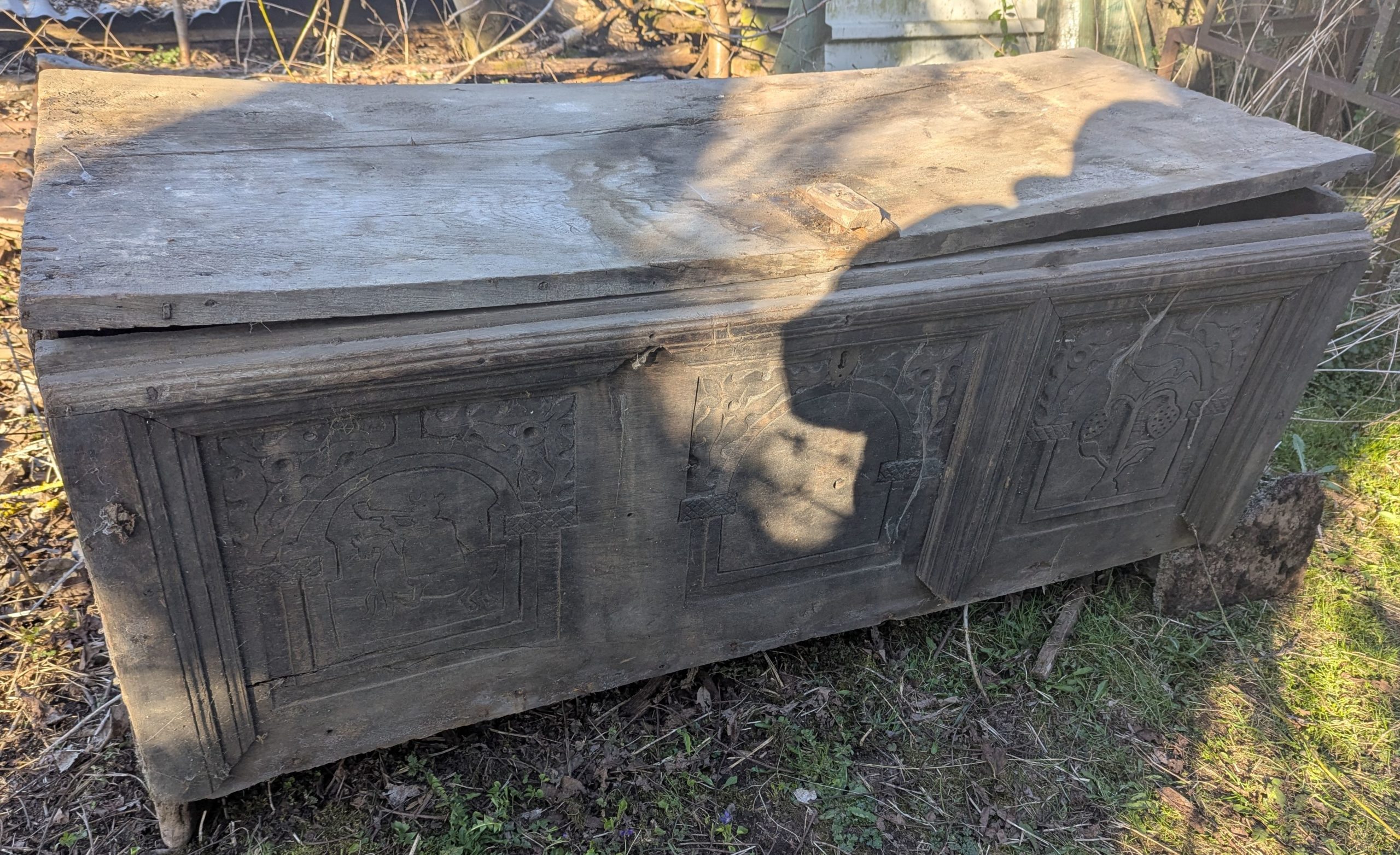 Exposé: Gotische Truhe aus Eichenholz – Anfang 16. Jahrhundert